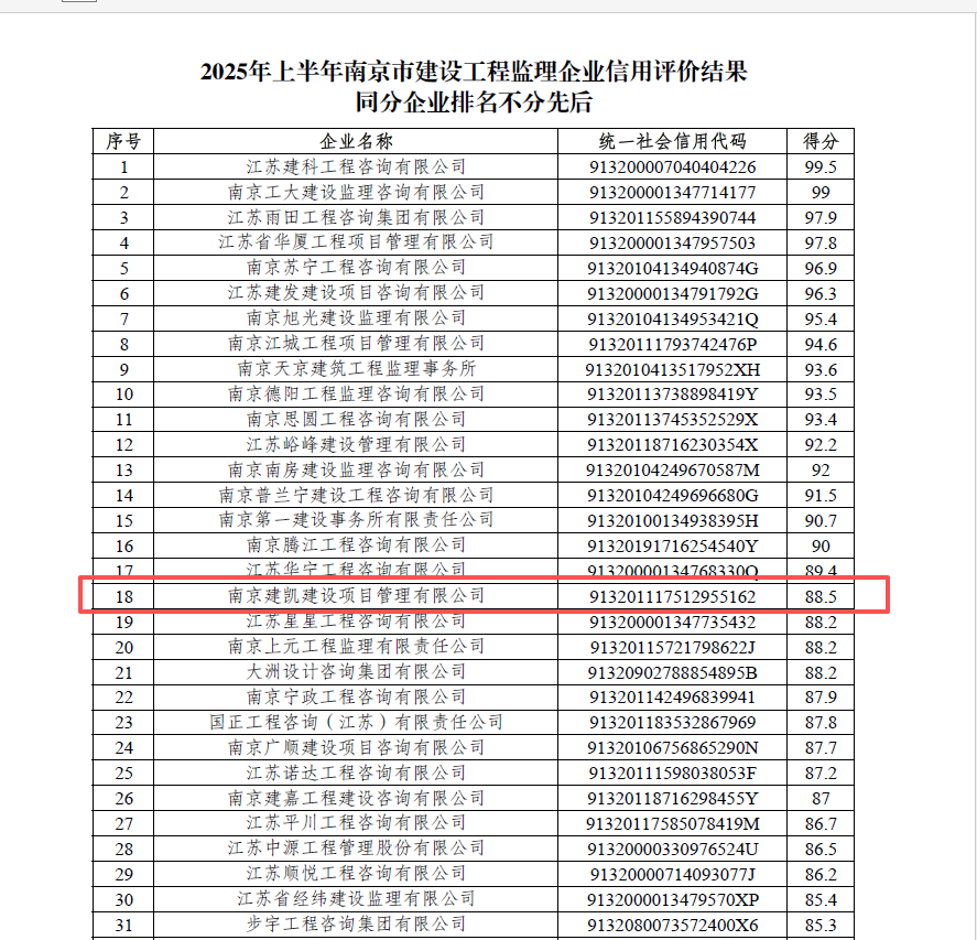 2025年上半年南京市建設(shè)工程監(jiān)理企業(yè)信用評(píng)價(jià)結(jié)果